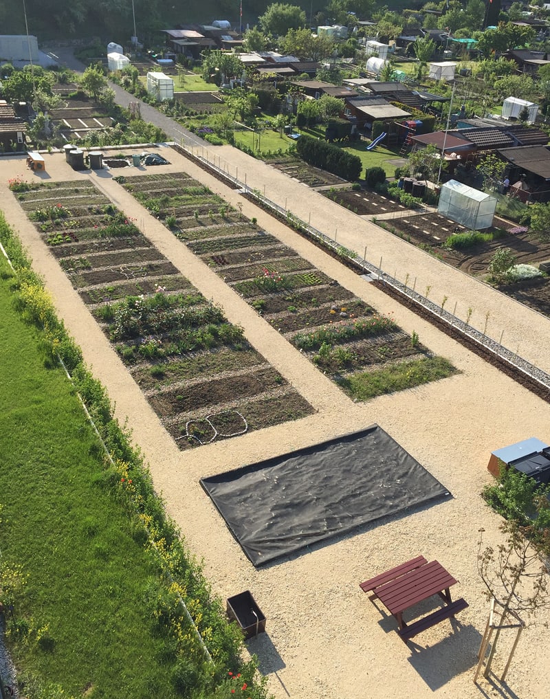 Mit einer optimal wärmegedämmten Gebäudehülle, kontrollierter Wohnungslüftung sowie erneuerbaren Energien bei der Wärmeerzeugung erfüllt das Gebäude den geforderten Minergie-P Standard. Balkongeländer und Pergolakonstruktion nehmen mit ihrer lebendigen Ausgestaltung Bezug zu den Lauben und Zäunen der angrenzenden Familiengärten.